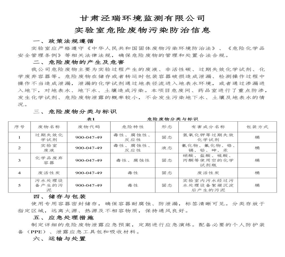 甘肅涇瑞環(huán)境監(jiān)測有限公司實(shí)驗(yàn)室危險廢物污染防治信息