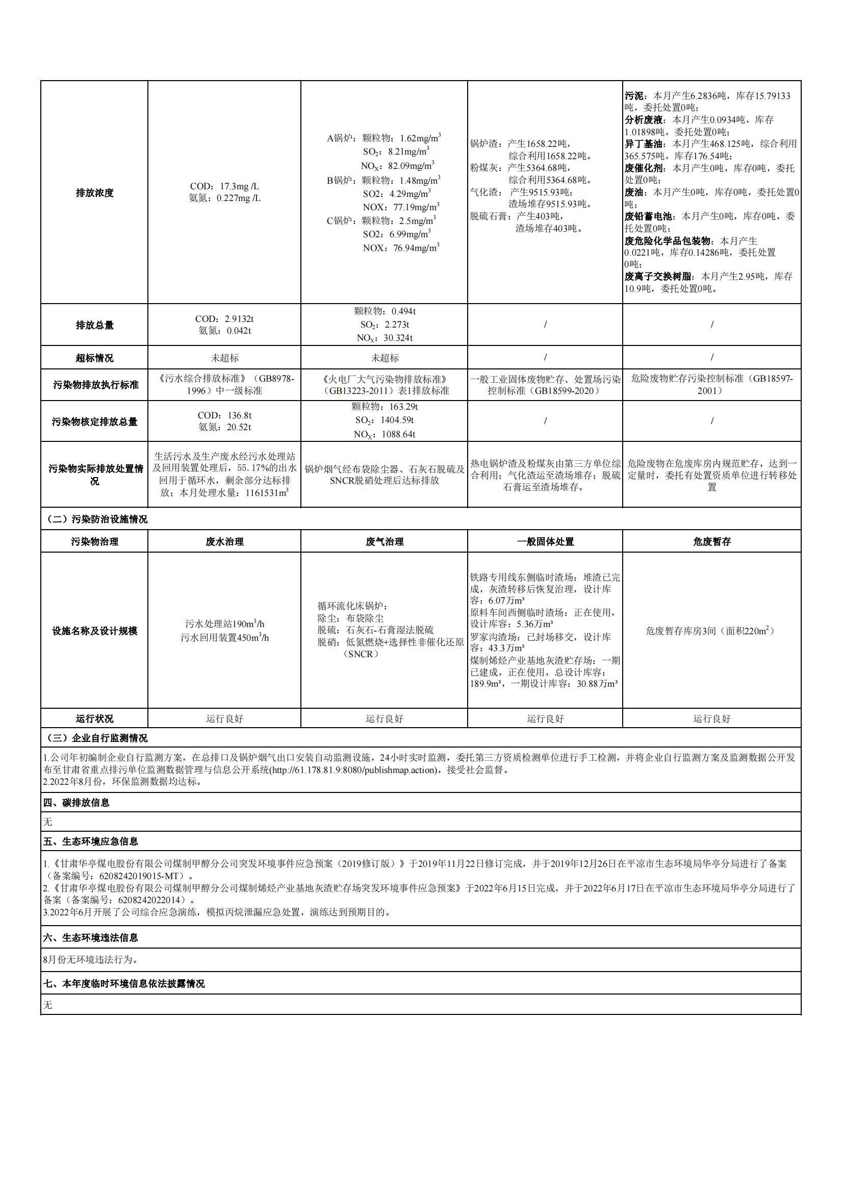 煤制甲醇分公司環(huán)境信息公開內(nèi)容(2022年8月)
